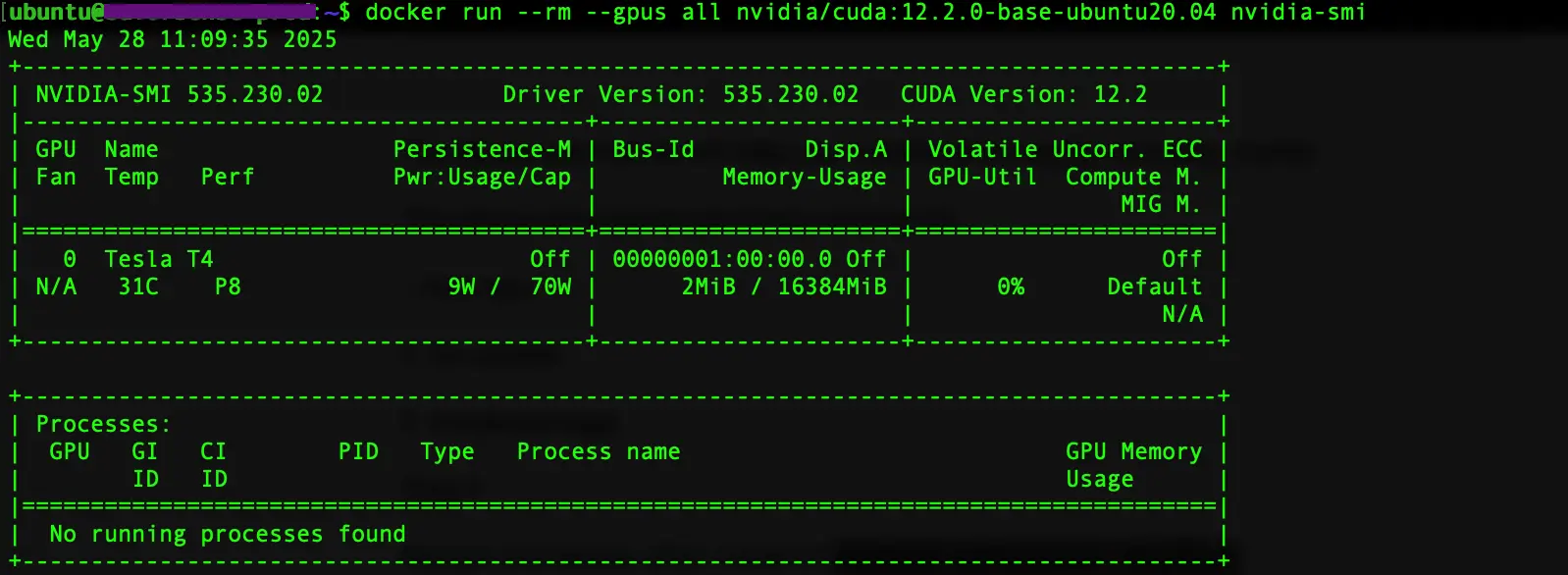 docker run --rm --gpus all nvidia/cuda:12.2.0-base-ubuntu20.04 nvidia-smi